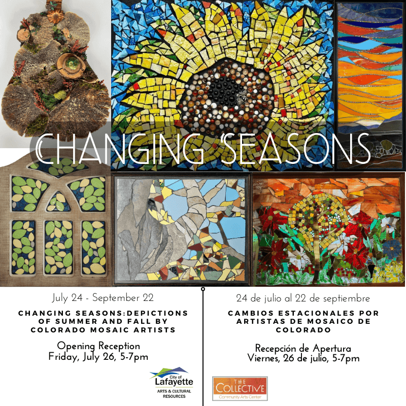 Join us during our opening reception night for our new exhibit Changing Seasons: Depictions of summer and fall by Colorado Mosaic Artists Friday, July 26 from 5-7pm at the The Collective located on N Public Rd in Old Town Lafayette!