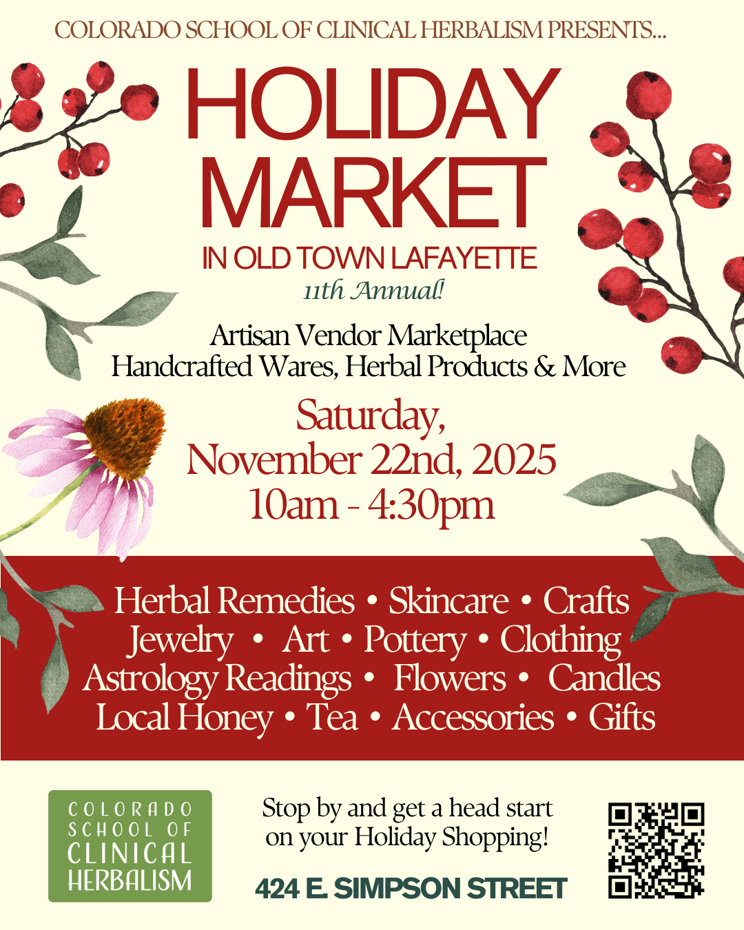 Join us for our 11th Annual Holiday Market at the Colorado School of Clinical Herbalism! This festive community event features an artisan marketplace with over 30 local vendors offering handcrafted goods and herbal products. Explore a wide variety of treasures including herbal remedies, skincare, crafts, jewelry, art, pottery, clothing, astrology readings, flowers, candles, local honey, tea, accessories, flower essence consultations, and so much more.