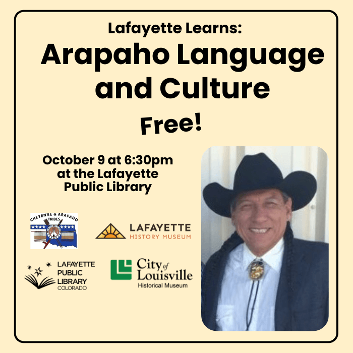 Join the Library and the Lafayette History Museum in welcoming Fred Mosqueda, the Arapaho Language and Culture Program Coordinator, as he shares the history of the Southern Arapaho tribe in Boulder County and the work he is doing to preserve the traditions and language of his tribe for future generations.
