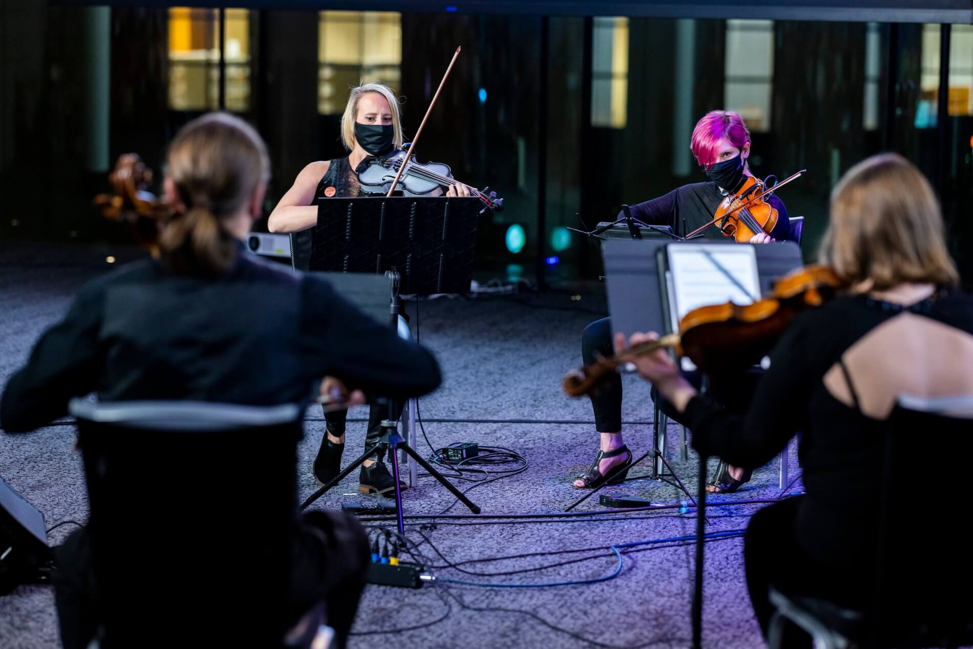 Performers include Sarah Whitnah (violin), Robyn Julyan (violin), Allyson Stibbards (viola), and David Short (cello).