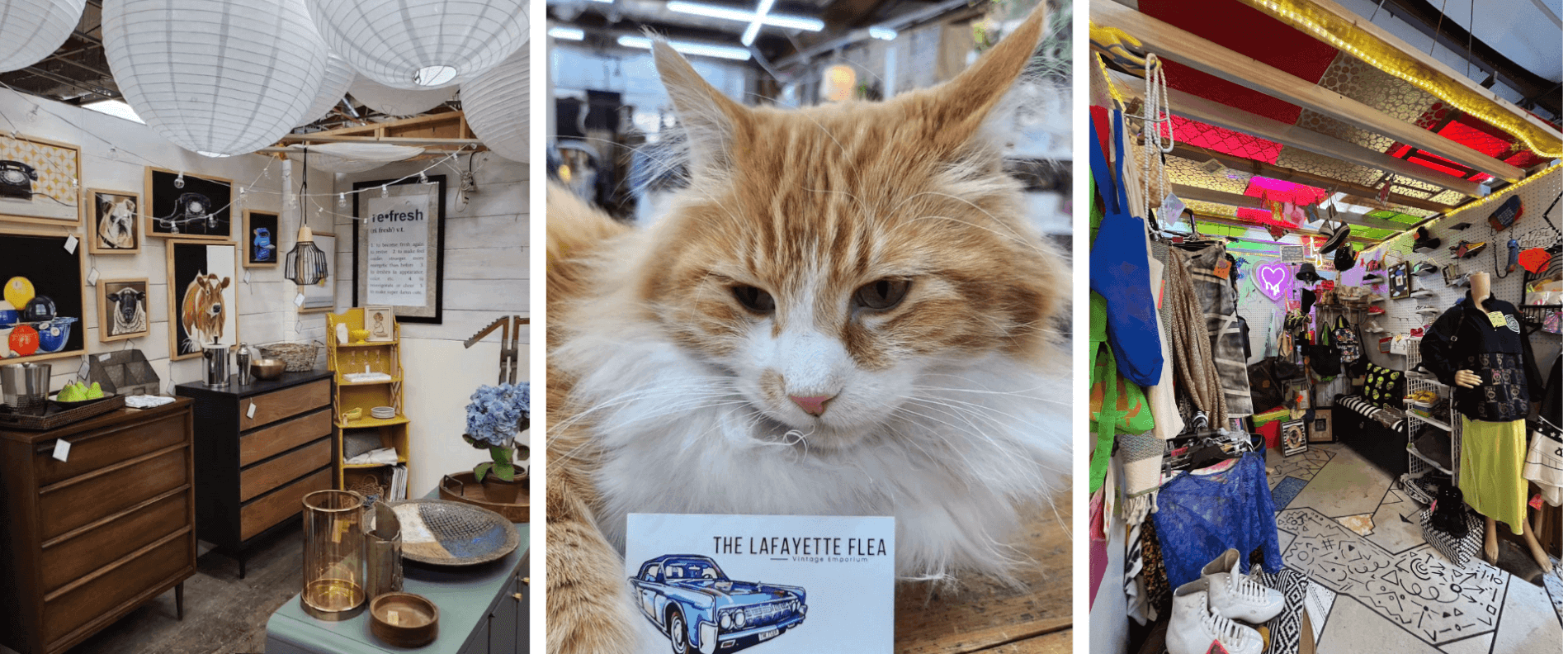 Since John’s ownership, the team updated the logo and changed the name to, “The Lafayette Flea: Vintage Emporium.” Their goal is to keep that original flea name in it, but bring the business up a notch and add more vintage, cool stuff. The vendors bring in new stuff every day and The Lafayette Flea is open 7 days a week, so their shoppers get to experience new stuff right as it comes in. They also have an adorable store cat named Beaux that is always ready to greet shoppers as they come in.